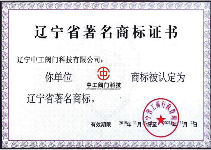 辽宁省著名商标证书